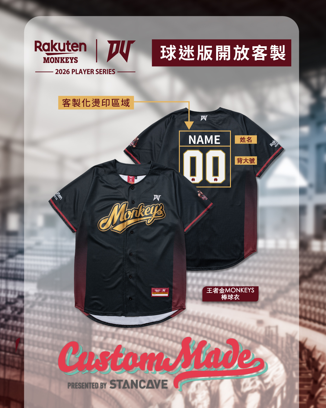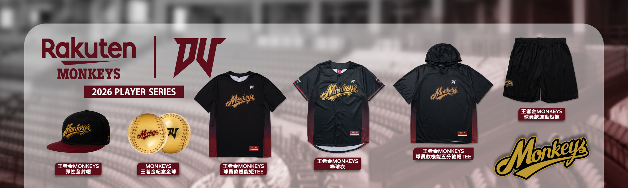 系列涵蓋球員同款機能服飾與多款收藏周邊,包括 機能短TEE、運動短褲、五分袖帽TEE與棒球衣,以及 MONKEYS 王者金紀念球,讓每一位球迷都能把這份榮耀穿上身、帶進日常。