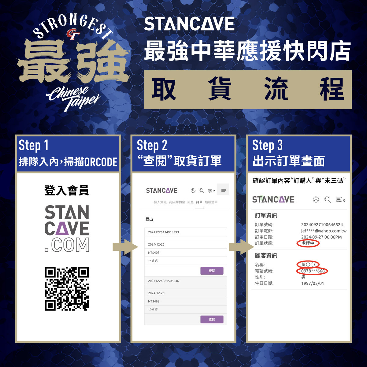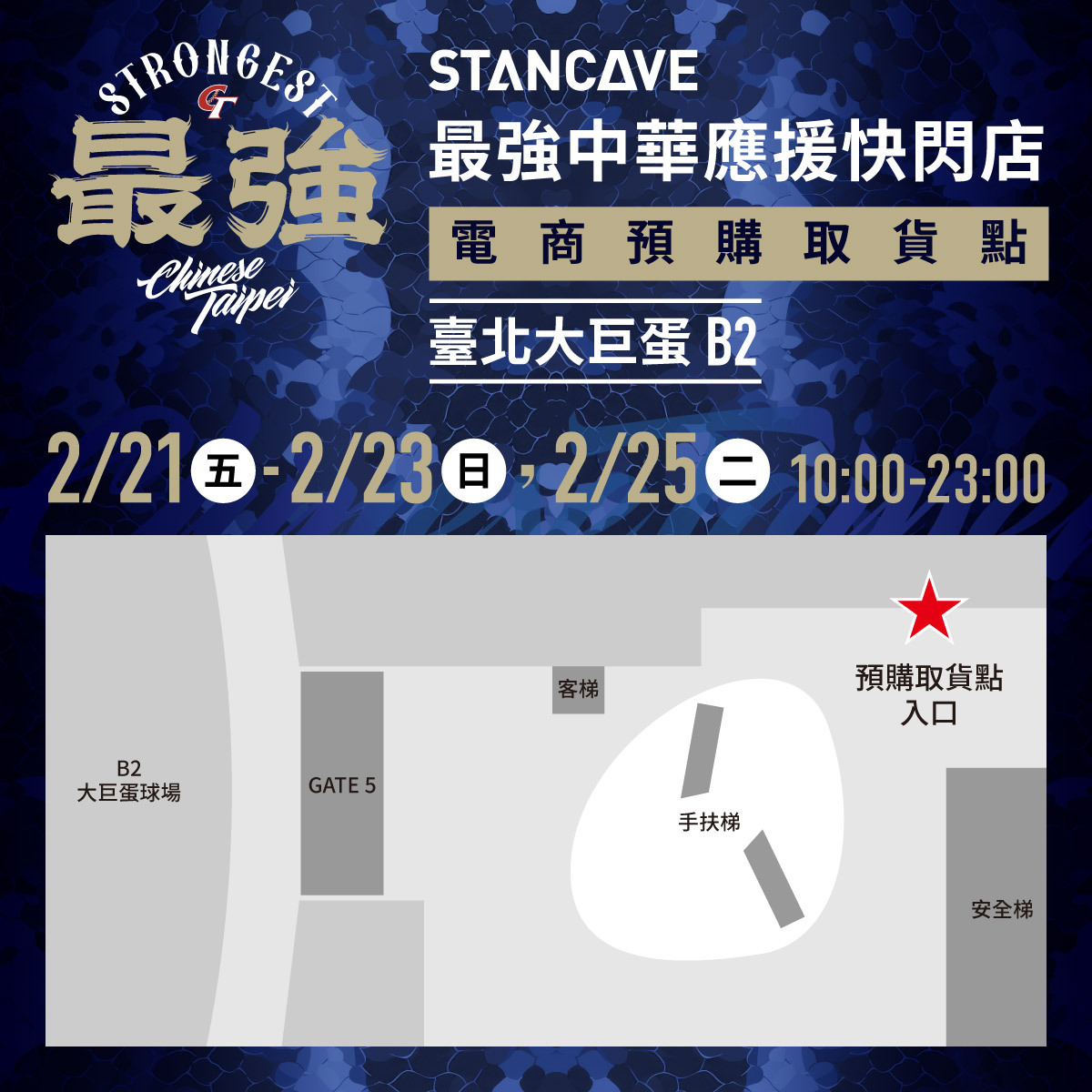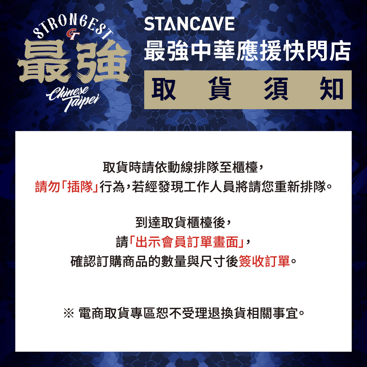 凡於STANCAVE訂購「WBCQ中華隊官方授權周邊商品」的顧客,請至臺北大巨蛋現場B2取貨區領取您的商品。