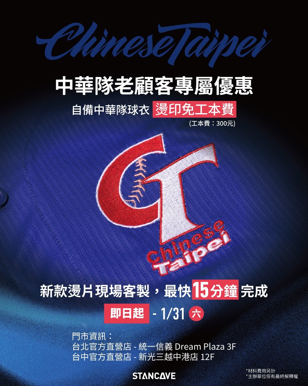 ・本活動「免工本費」優惠僅適用於 STANCAVE 購買過的中華隊球衣。 ・STANCAVE 保有活動最終解釋及變更權利