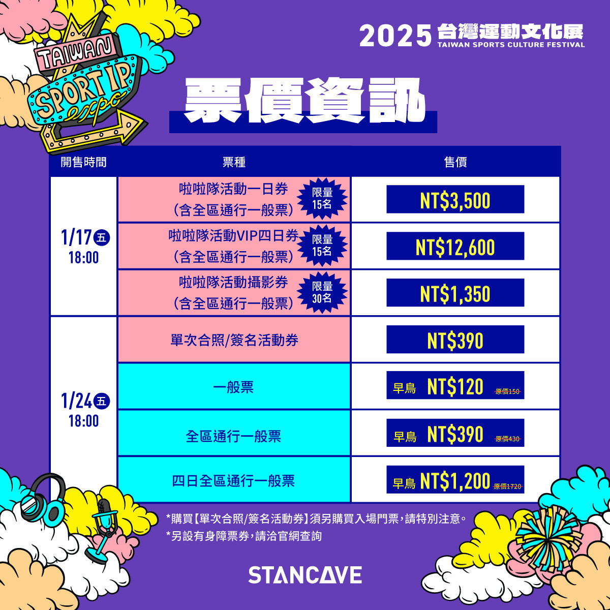 「2025 STANCAVE台灣運動文化展」也將祭出3種入場門票,其中純逛展的「一般票」、可參與體驗活動的「全區通行一般票」,以及「四日全區通行一般票」。以及4種活動票券,擁有啦啦隊女孩合照簽名會資格的「活動券」,也分為「活動一日券」(含門票)、「VIP四日券」(含門票)和「單日攝影券」(含門票),也有「單次合照/簽名活動券」供選擇。