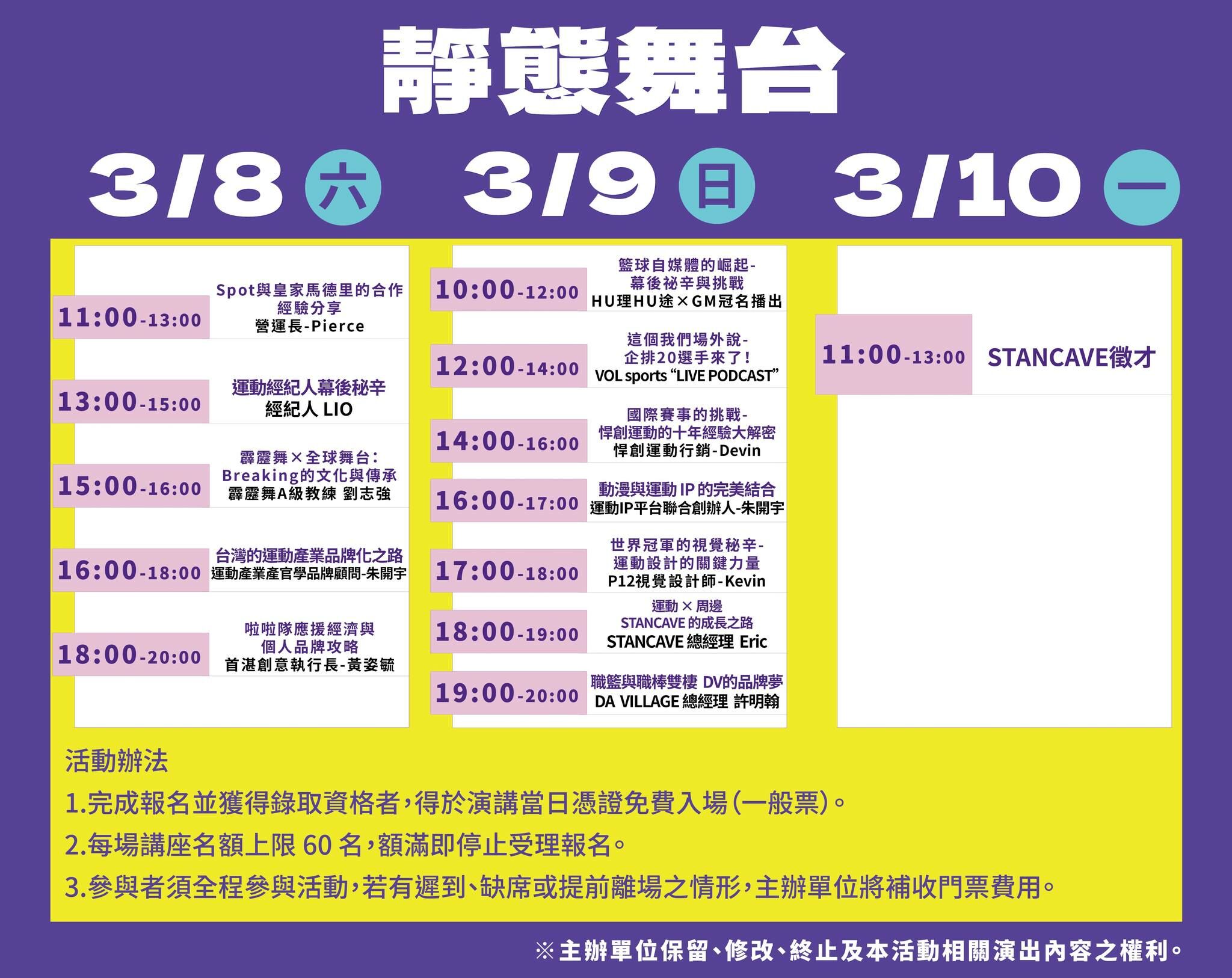 率先登場的是超妡SPOT,與大家分享近年短影音當道,SPOT的影音資料庫是如何協助職棒與職籃的球隊在影像紀錄及剪輯上有了更多可能性,更快速的搜尋影片、更方便的剪輯及上傳功能,近期更是與皇家馬德里合作,用自己的方式讓台灣走向世界;接著是職棒球員陳傑憲的經紀人LIO來分享作為運動經紀人,看起來光鮮量的背後故事;而在巴黎奧運首次登場的霹靂舞,其實在台灣已經發展多年,作為台灣霹靂舞元老級人物,要來說說台灣霹靂舞的發展史;從啦啦隊轉型成幕後工作人員的黃姿毓,近期也開辦了自己的公司首湛創意,這樣的心路里程也在將是首次與大家面對面分享。
