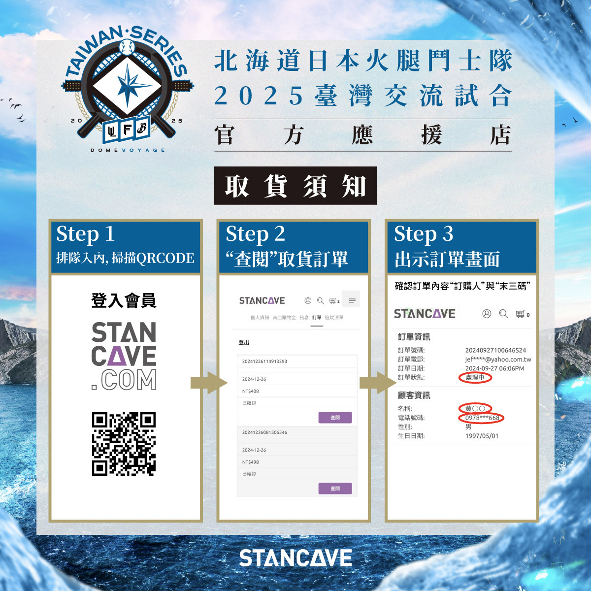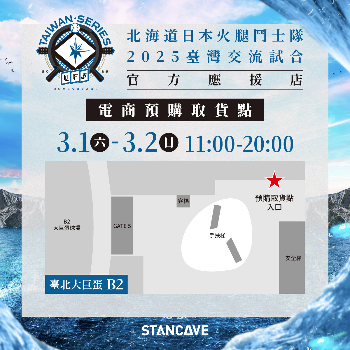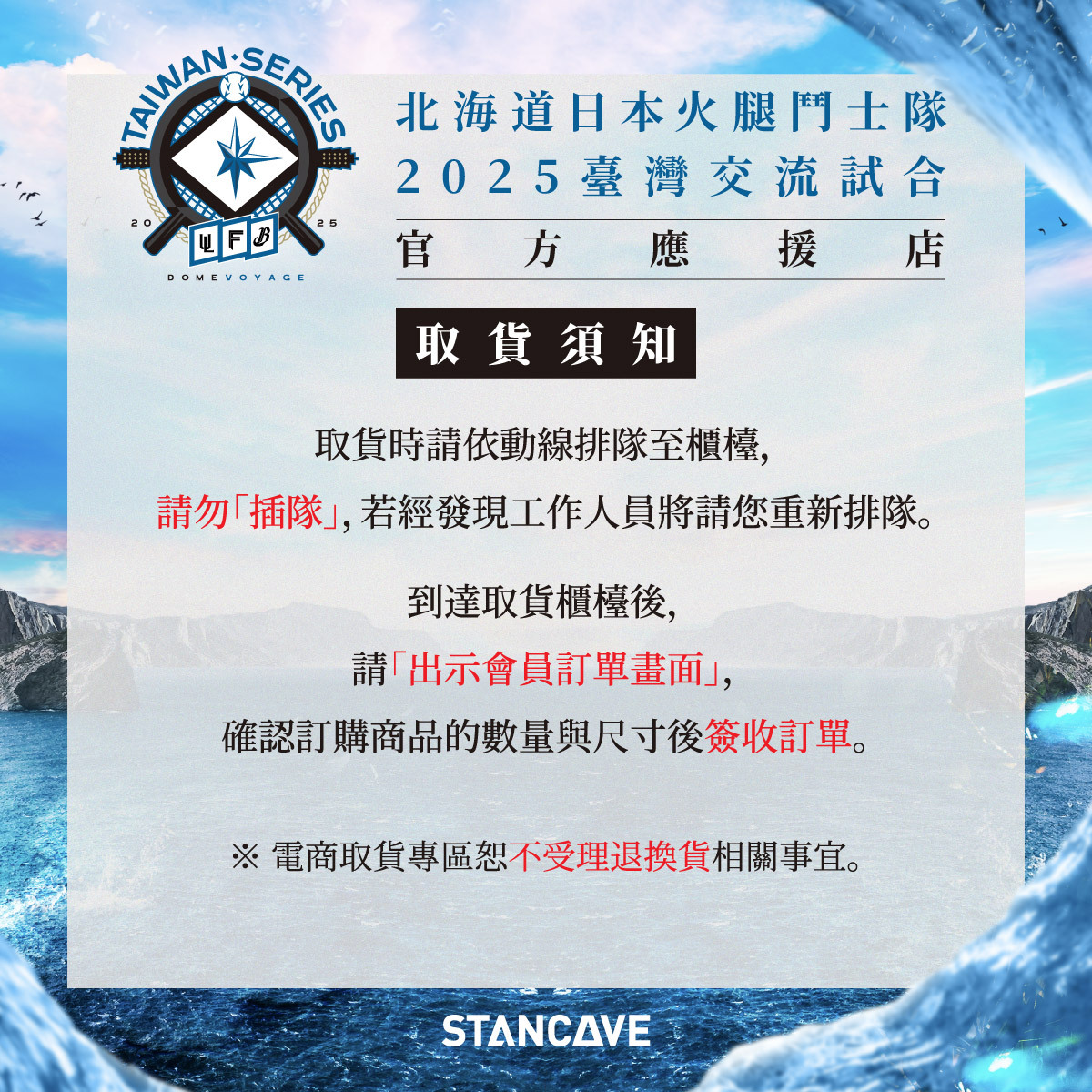 凡於STANCAVE訂購「北海道日本火腿鬥士隊2025臺灣交流試合周邊商品」的顧客,請至臺北大巨蛋現場B2取貨區領取您的商品。