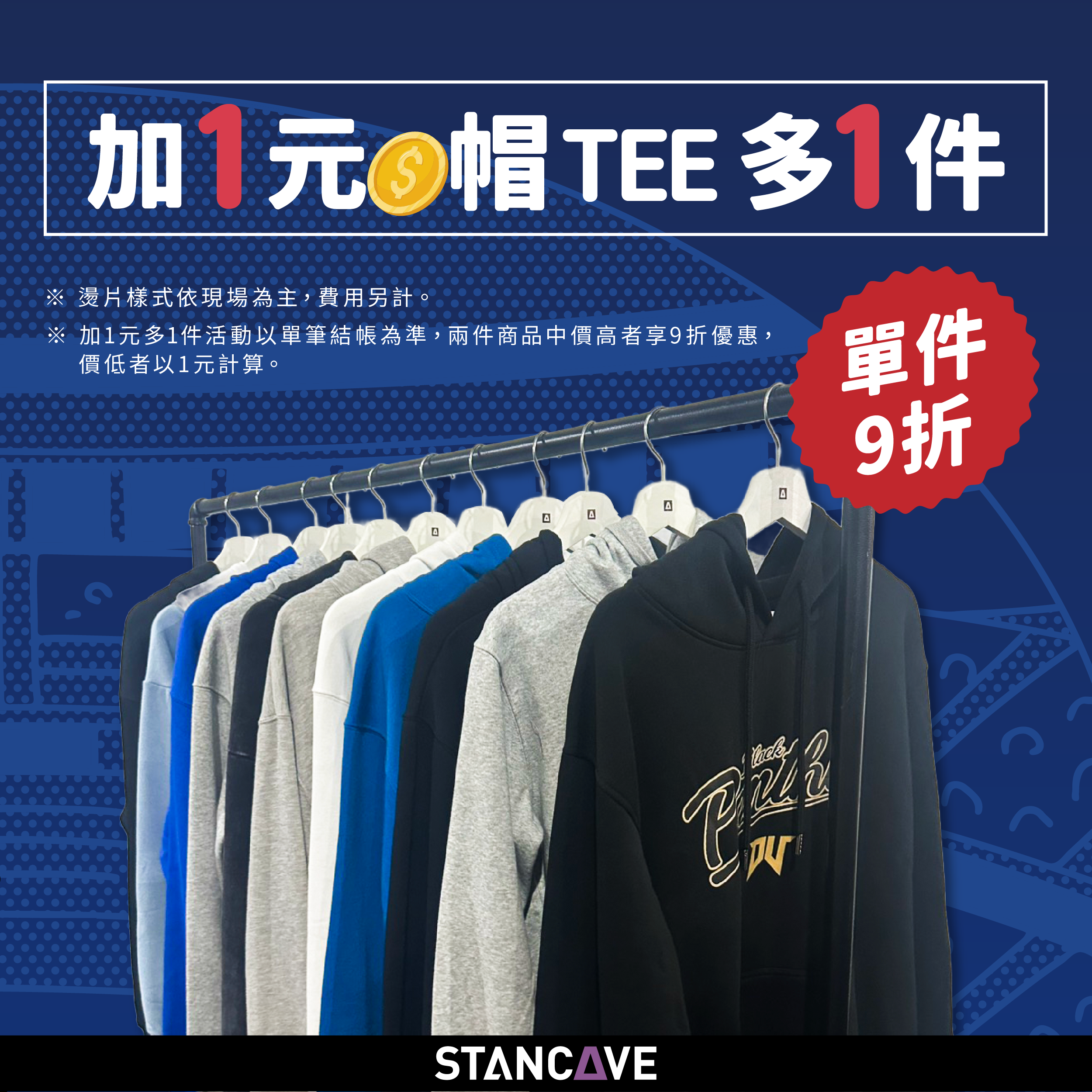 任選兩件帽TEE,價高者享 9 折,再加 1 元就能把第 2 件帶回家!