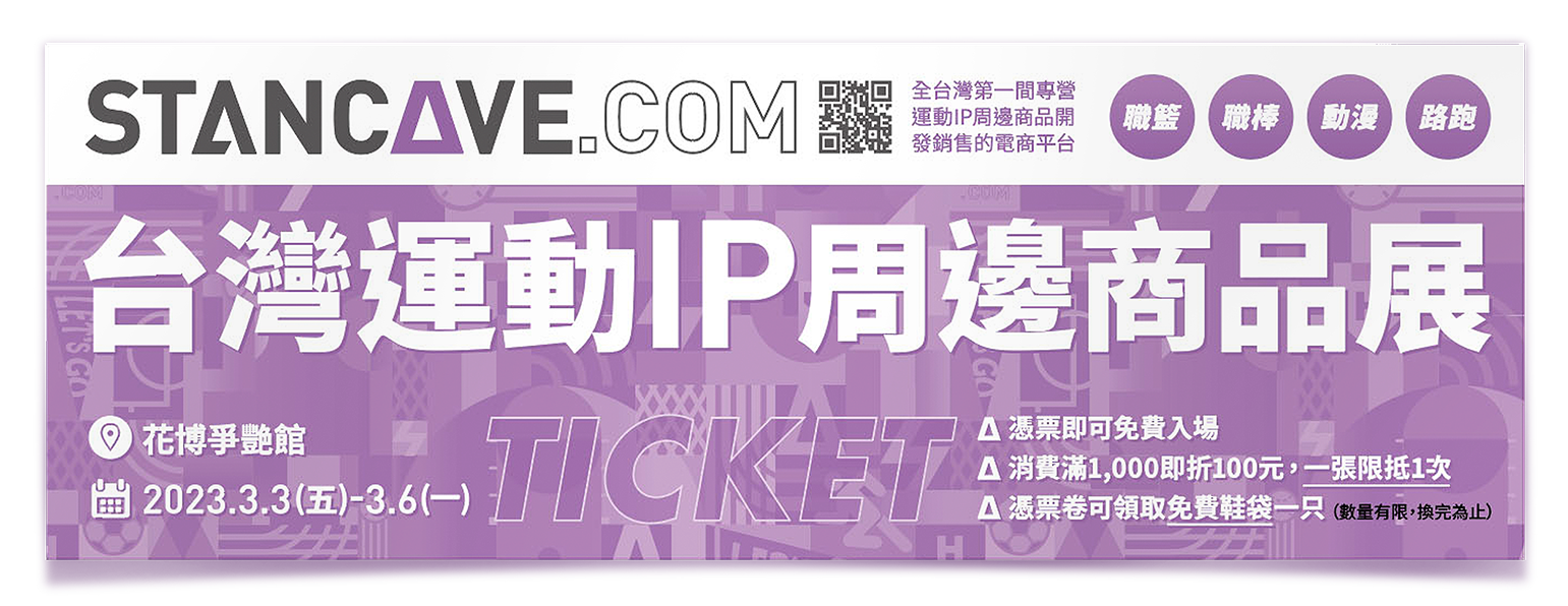 台灣運動IP(Intellectual Property,知識產權)整合平台STANCAVE將於3月3日(五)至3月6日(一)在臺北花博爭艷館的台灣國際觀光旅遊展中,獨步全台首創台灣運動IP周邊商品展,包含職棒、職籃、路跑與運動文創類型等超過30家以上的各式台灣運動IP,將一同打造春季最盛大且全台唯一的台灣運動圈盛會,共同傳遞專屬在地特色的台灣運動文化之美!